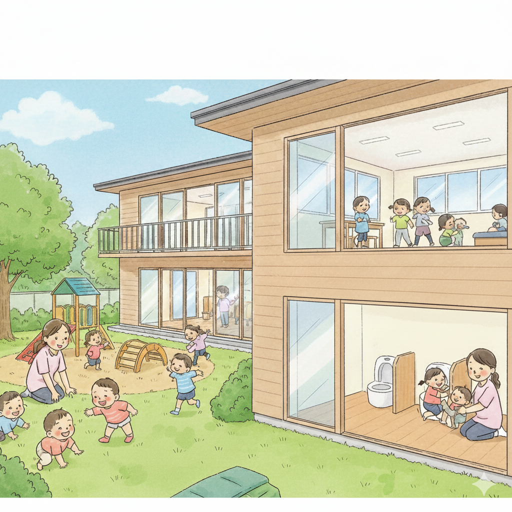 | 乳児(0歳) | おむつ替えがメイン。保育室内に汚物処理コーナーを設ける。 |